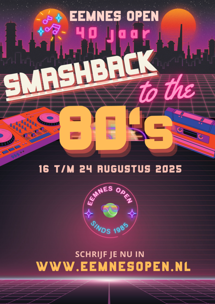 Van 16 tot en met 24 augustus 2025 is het tijd om je retro outfit uit de kast te trekken en je racket mee te nemen, want we verwelkomen je op de banen van Tennisvereniging Eemnes voor een week vol sportiviteit, gezelligheid en een flinke dosis nostalgie! Onder het motto ‘Smashback to the 80’s’ nemen we een duik in de felle kleuren en de muziek van de jaren ’80, maar kijken we vooral vooruit naar een nieuwe editie vol spelplezier en gezelligheid.